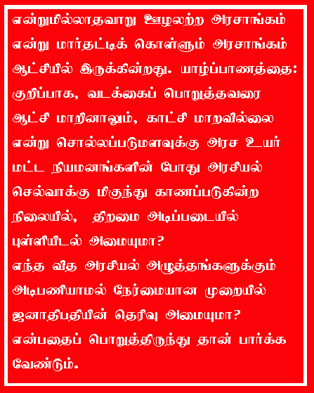என்றுமில்லாதவாறு ஊழலற்ற அரசாங்கம் என்று மார்தட்டிக் கொள்ளும் அரசாங்கம் ஆட்சியில் இருக்கின்றது. யாழ்ப்பாணத்தை – குறிப்பாக வடக்கைப் பொறுத்தவரை ஆட்சி மாறினாலும், காட்சி மாறவில்லை என்று சொல்லப்படுமளவுக்கு அரச உயர்மட்ட நியமனங்களின் போது அரசியல் செல்வாக்கு மிகுந்து காணப்படுகின்ற நிலையில், திறமை அடிப்படையில் புள்ளியிடல் அமையுமா? எந்த வித அழுத்தங்களுக்கும் அடிபணியாமல் நேர்மையான முறையில் ஜனாதிபதியின் தெரிவு அமையுமா? என்பதைப் பொறுத்திருந்து தான் பார்க்க வேண்டும்.