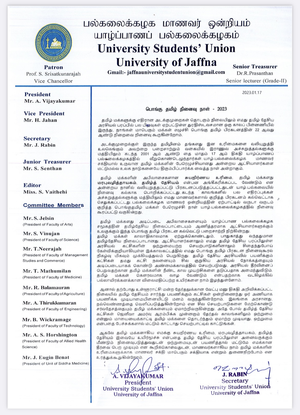 அடக்குமுறைக்குள் இருந்த தமிழினம் தங்களது இன உரிமைகளை வலியுறுத்தி உலகெங்கும் அவற்றை பறைசாற்றும் வகையில் இராணுவ அச்சுறுத்தல்களுக்கு மத்தியிலும் கடந்த 2001 ஆம் ஆண்டு தை மாதம் 17 ஆம் திகதி யாழ்ப்பாணப் பல்கலைக்கழகத்தில் வீறுகொண்டெழுந்தார்கள்.