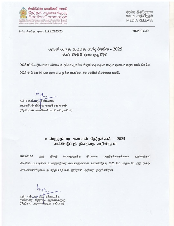 இது தொடர்பான உத்தியோகபூர்வ அறிவித்தலை தேர்தல் ஆணைக்குழுவின் தவிசாளர் ஆ◌ா.எம்.ஏ.எல் ரத்னாயக்க இன்று காலை வெளியிட்டார்.