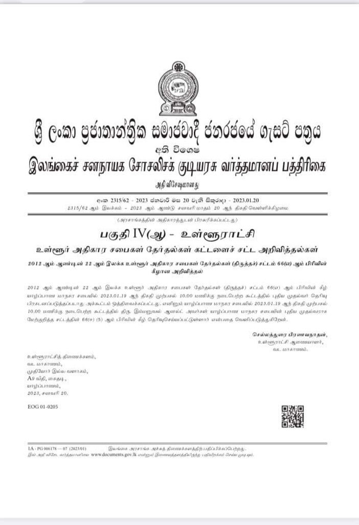 யாழ்ப்பாணம் மாநகர சபையின் முதல்வராக, முன்னாள் முதல்வர் இ. ஆர்னோல்ட் பிரகடனப்படுத்தப்பட்டுள்ளார். . இந்தப் பிரகடனத்தைத் தாங்கிய 2315/62 ஆம் இலக்க விசேட வர்த்தமானி நேற்று நள்ளிரவு வெளியாகியது.